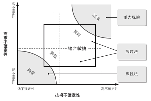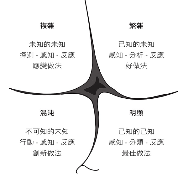 - 肯內芬框架(Cynefin):複雜(敏捷)、繁雜、混沌、明顯(瀑布)。